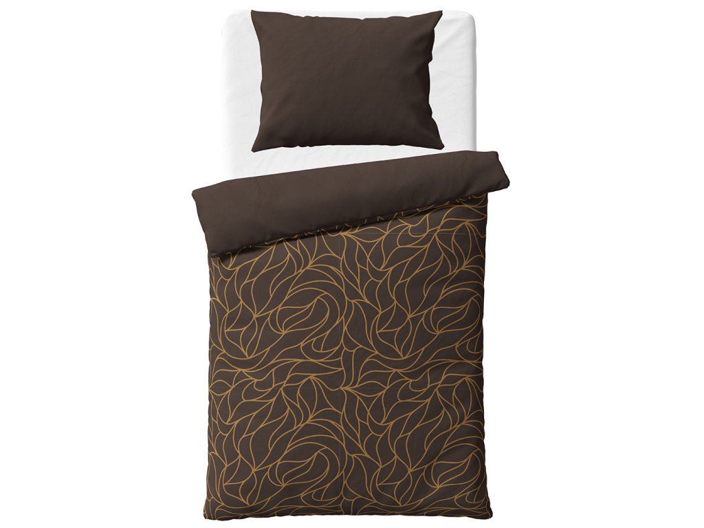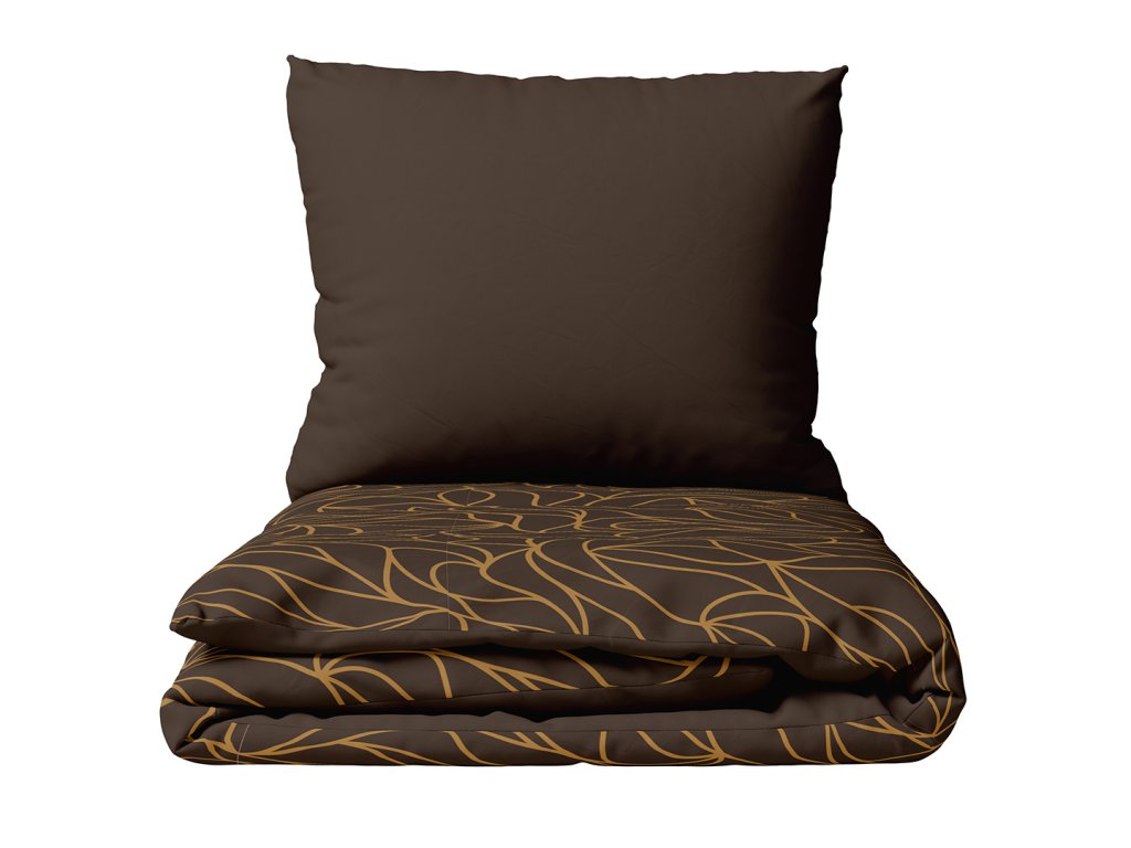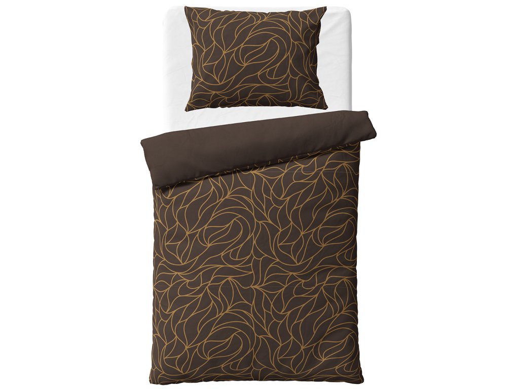 Lícní strana povlečení je zdobena decentním abstraktním vzorem v hnědo-karamelových odstínech, který připomíná jemné proplétající se linie