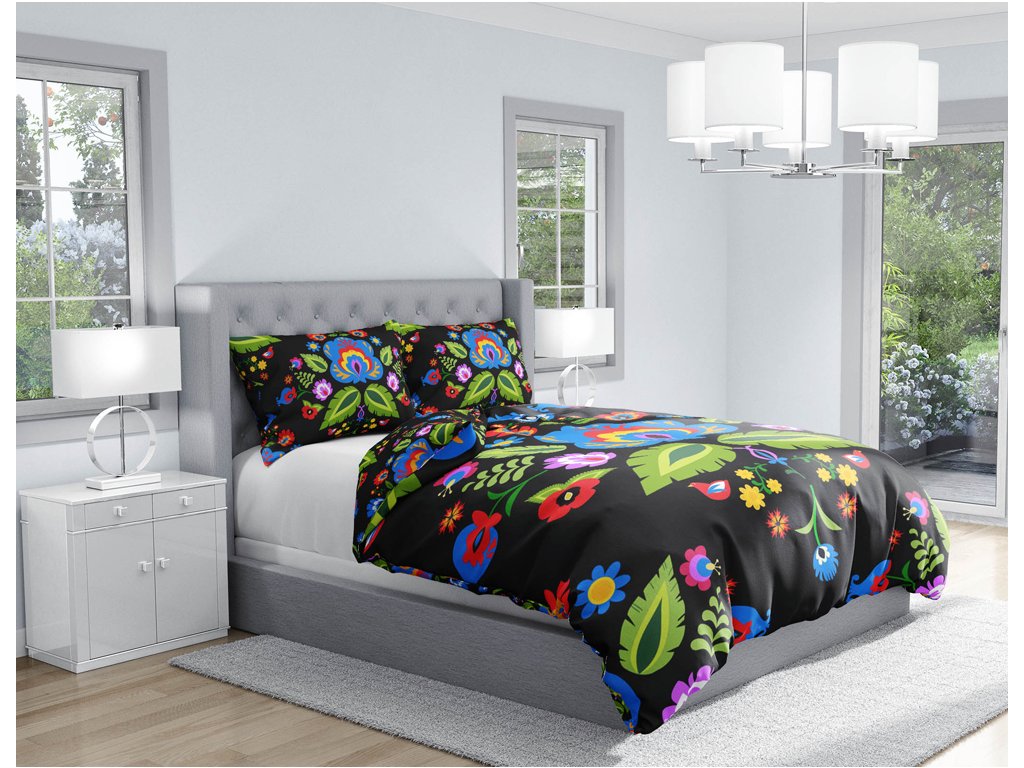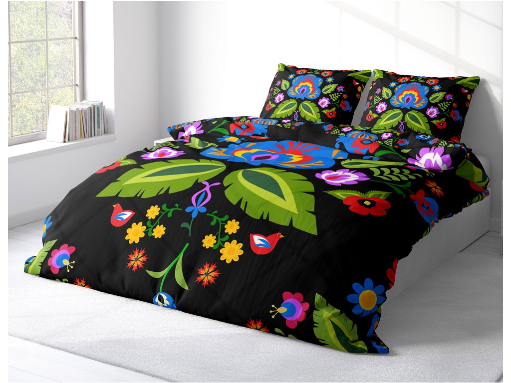 Na lícní straně černého povlečení jsou velké folklórní květy v barvách modré, červené, žluté, zelené ve větším formátu, než na straně druhé, nebo opačné