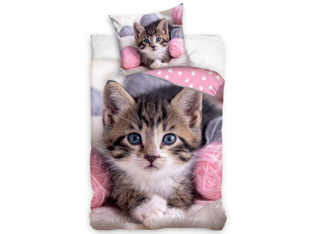 Koťátko je obklopené klubíčky růžové příze, které dodávají povlečení hravost a jemný design