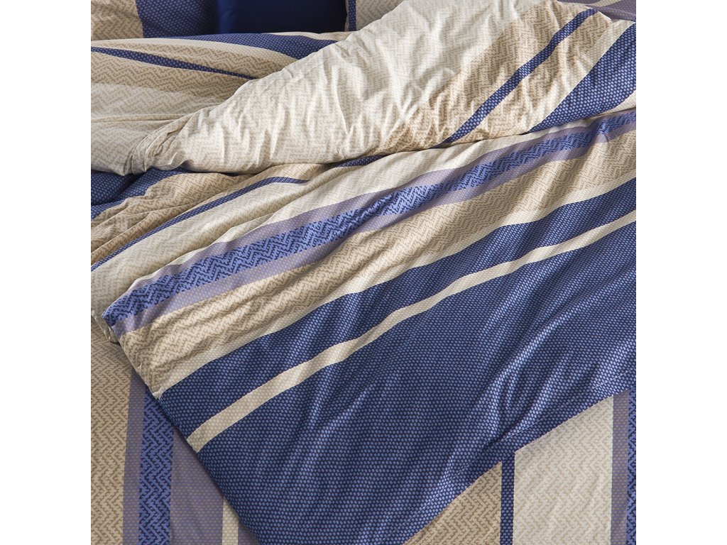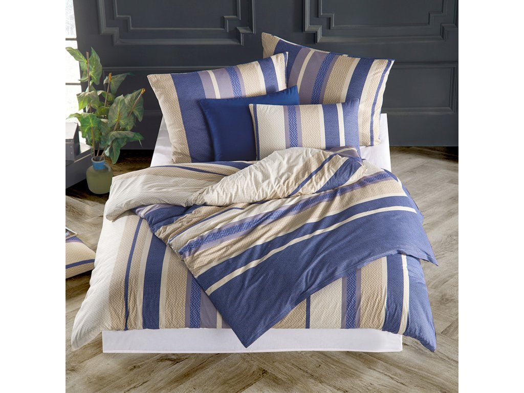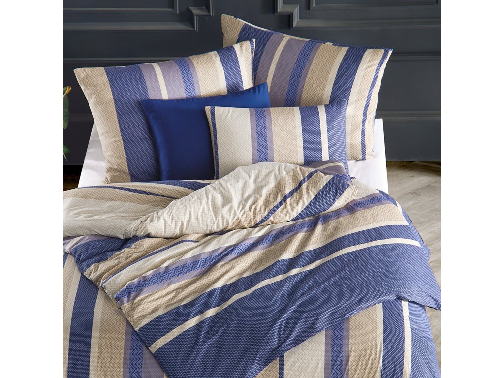 Na povlaku přikrývky vedou modré a béžové pruhy svisle směrem dolu