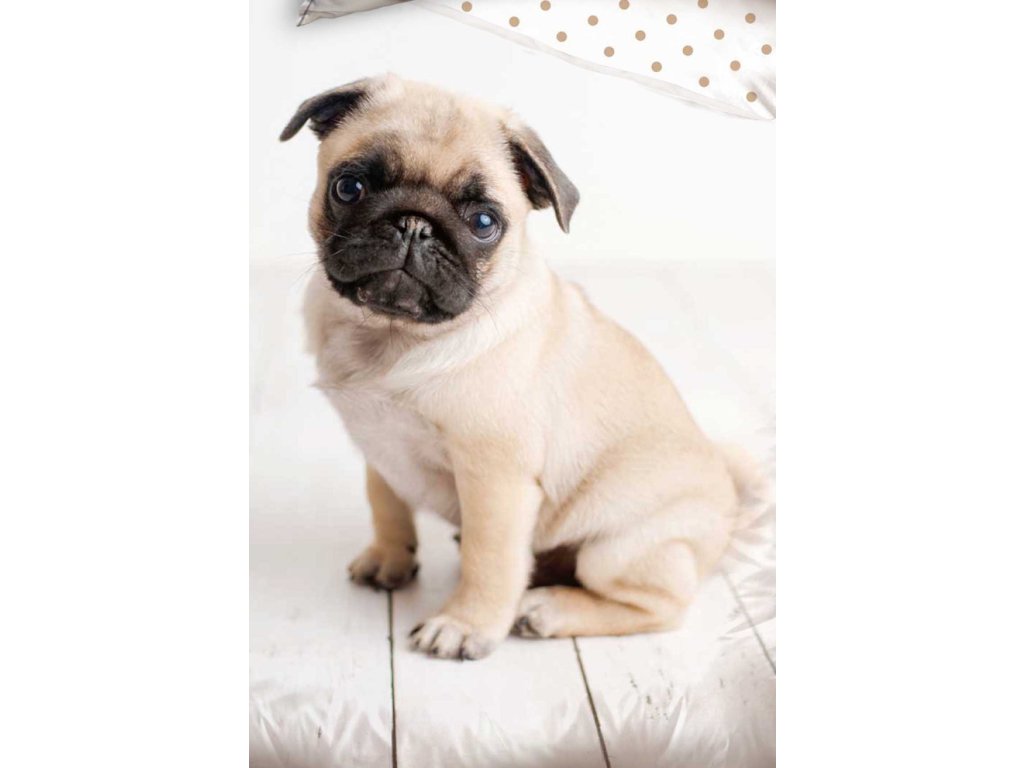 Na lícní straně povlaku přikrývky sedí malý mopsík, s vykulenýma hnědýma očima a tváří se, že ten koš se smetím neroztahal on :)))