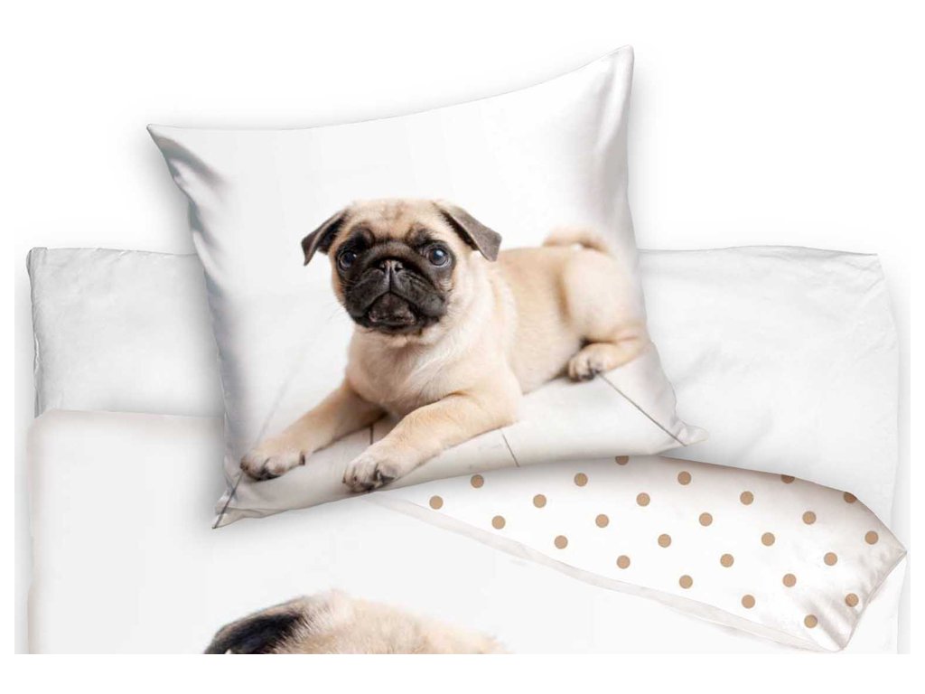 Povlak polštáře je z obou stran stejný, s ležícím mopsíkem