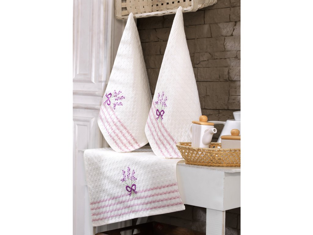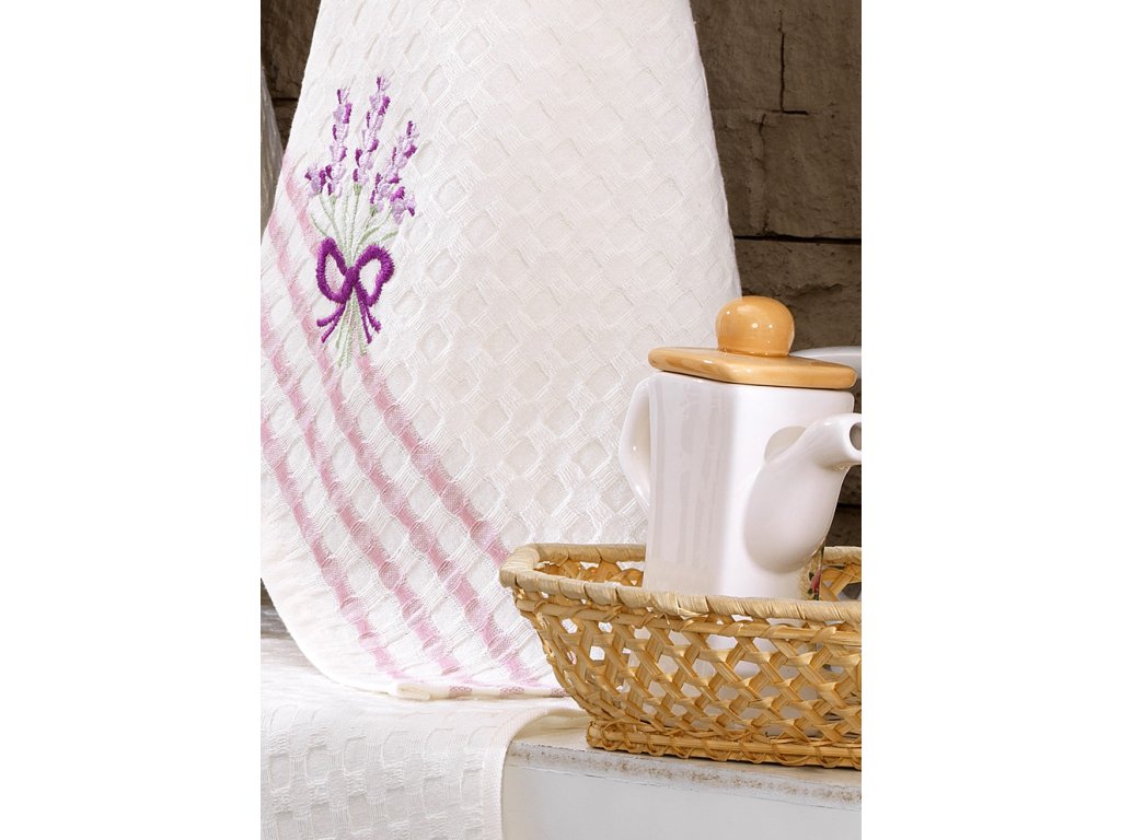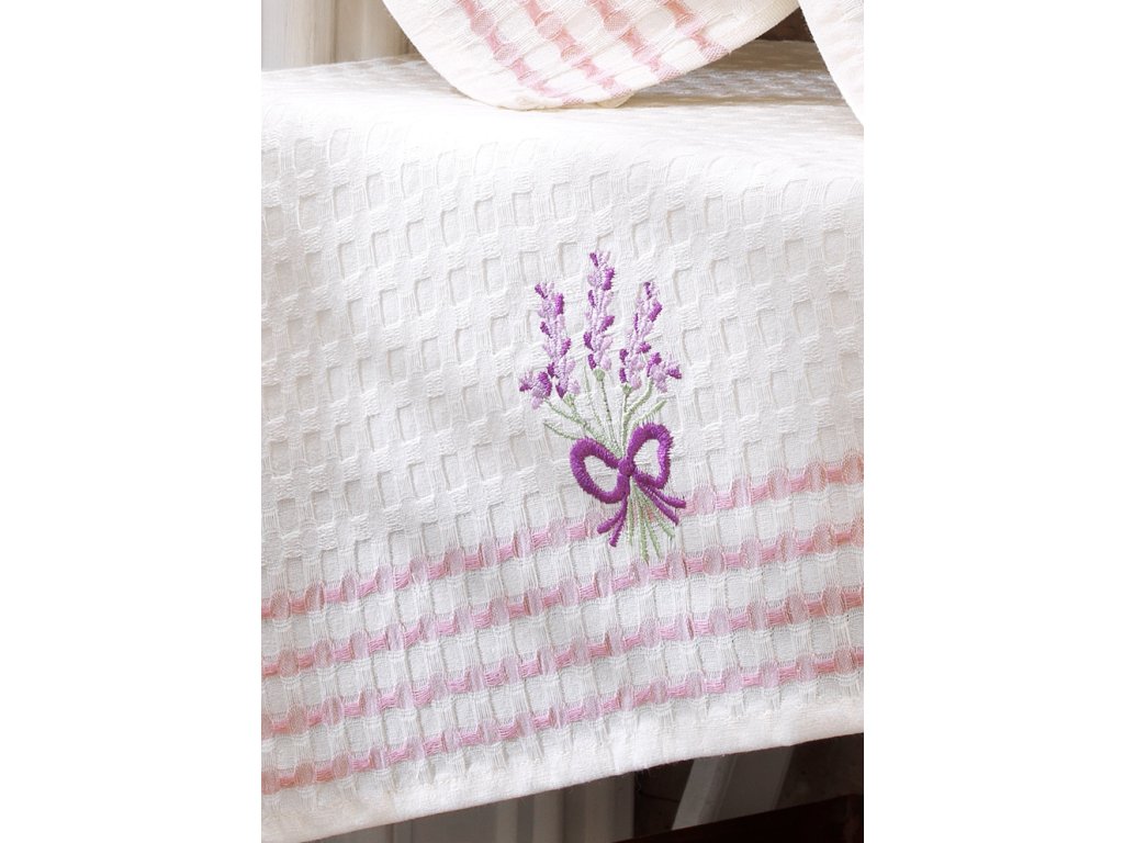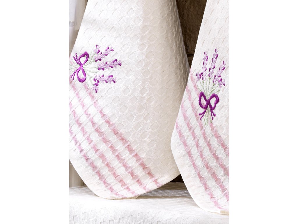 Na každé utěrce je vyšitá kytička levandule převázaná mašlí