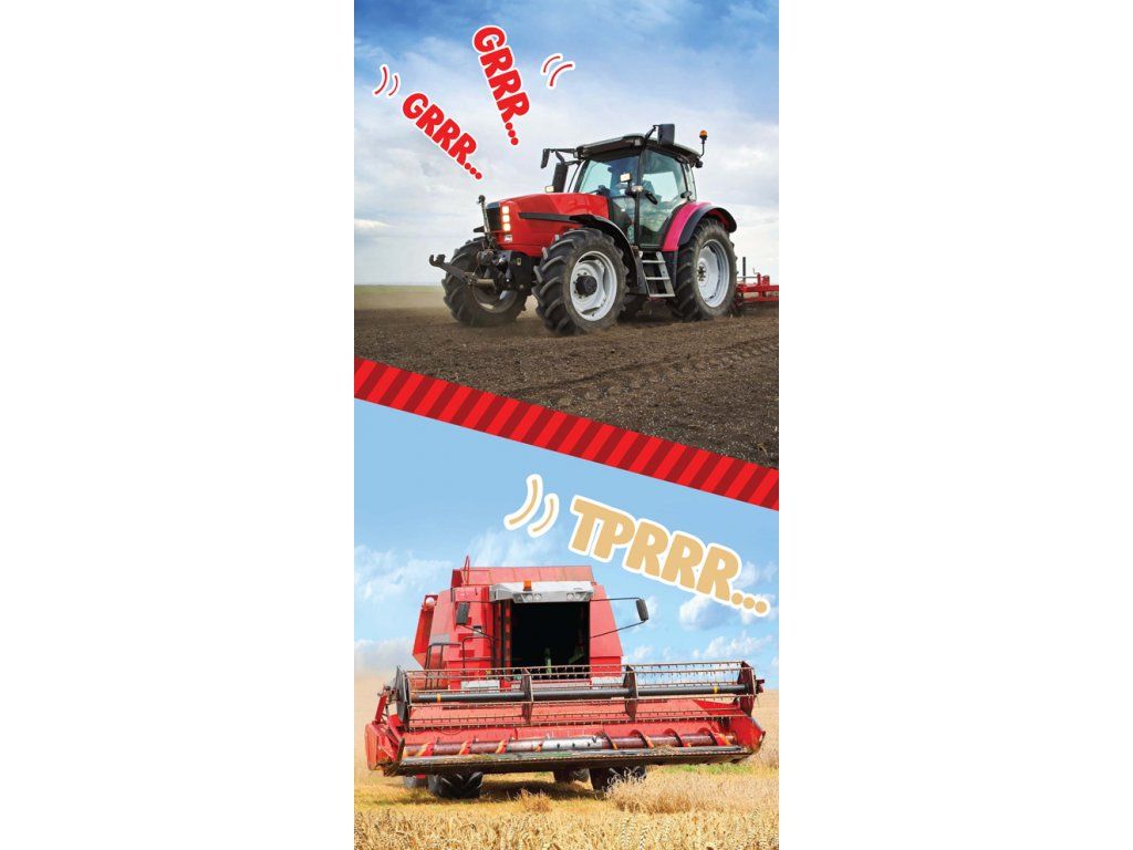 V té horní, je velký červený traktor na poli a z jeho motoru se ozývá zvuk "GRR,GRRR.."