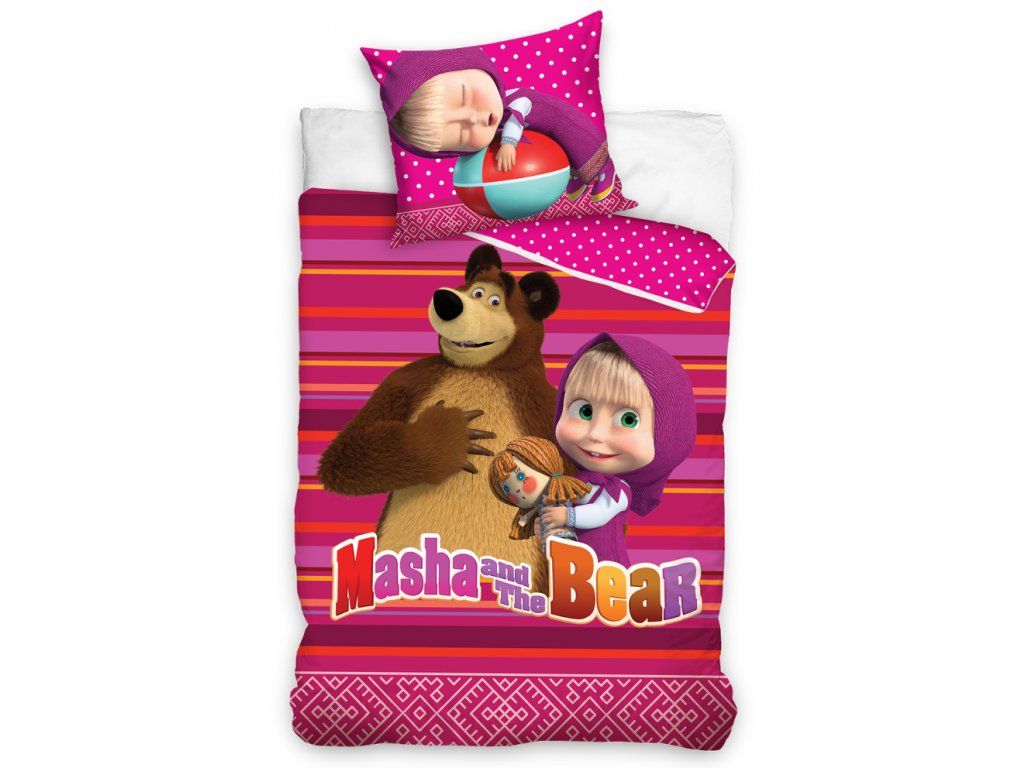 Oboustranné povlečení s obrázkem medvěda Míši a holčičky Máši na pruhovaném podkladu na přední straně, rubová strana je poseta puntíky.