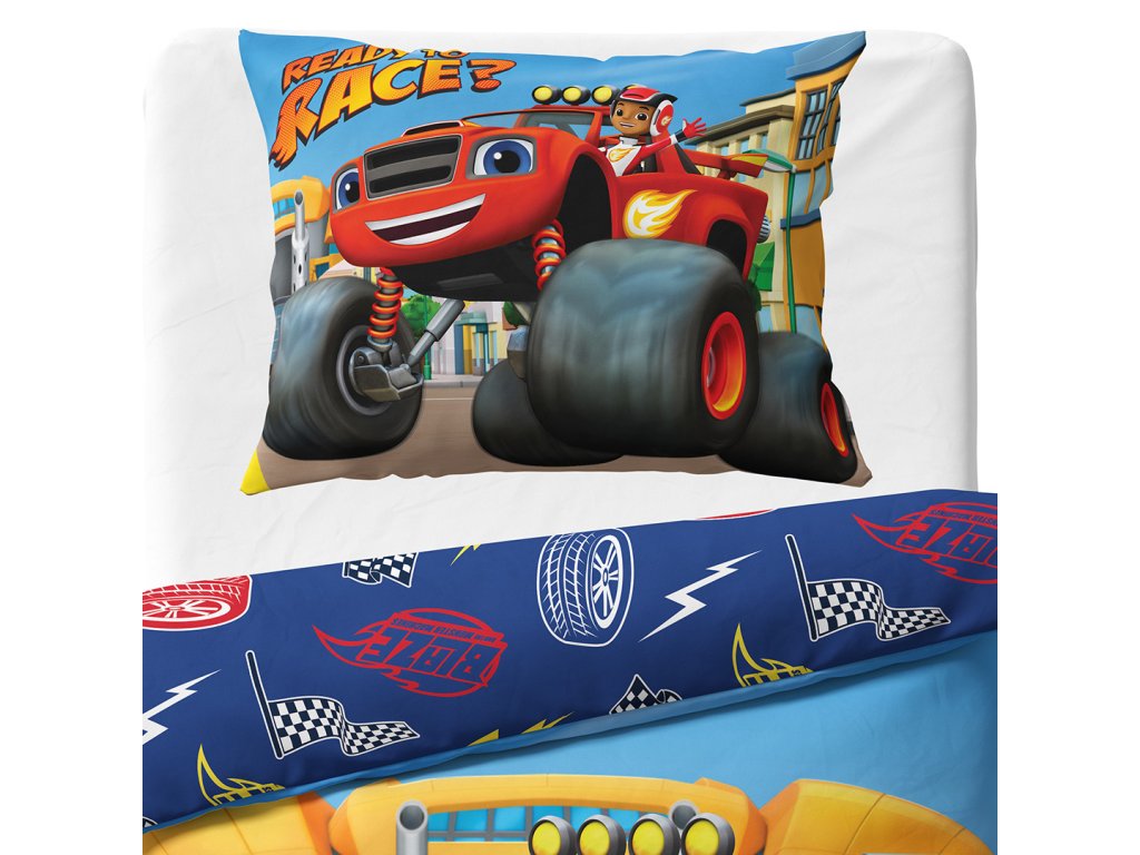 Dětské povlečení Plamínek a Čtyřkoláci Připraven na závod doporučujeme prostěradlo v barvách modrá, červená, sytě žlutá