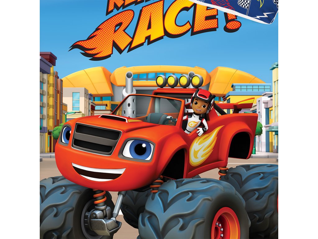 Po celé ploše jsou rozmístěny motivy typické pro svět závodů , černobílé šachovnicové vlajky, pneumatiky, červené i žluté blesky a logo BLAZE Monster Machines v červené a bílé barvě.