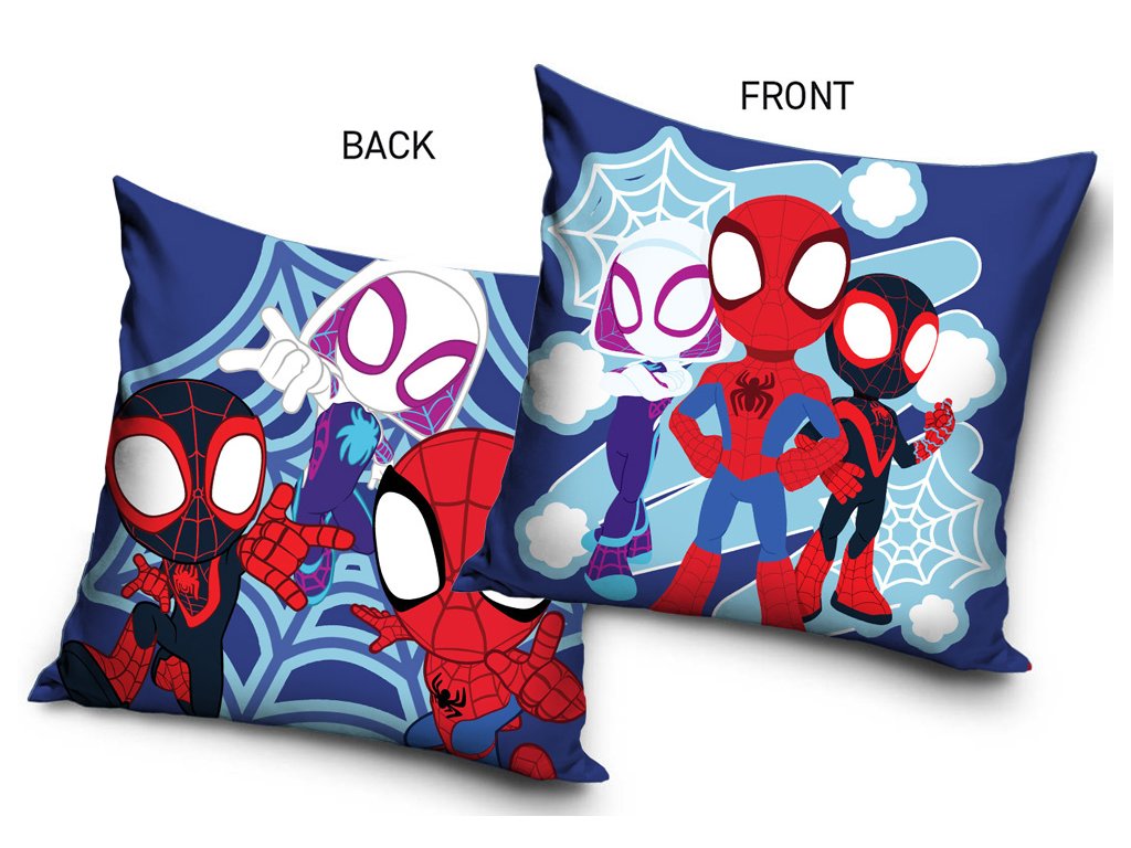 Povlak na polštářek Spidey Superhrdinové o rozměru 40 × 40 cm je vyroben z 100% veluru připomínajícího samet s gramáží 190 g/m², který je hebký na dotek a zvýrazňuje barvy potisku. Má praktické zipové zapínání pro snadné navlékání. Oboustranný design inspirovaný seriálem Spidey a jeho úžasní přátelé s motivy Spideyho, Spina a Ghost-Spider je ideální dekorací i dárkem do dětského pokoje.