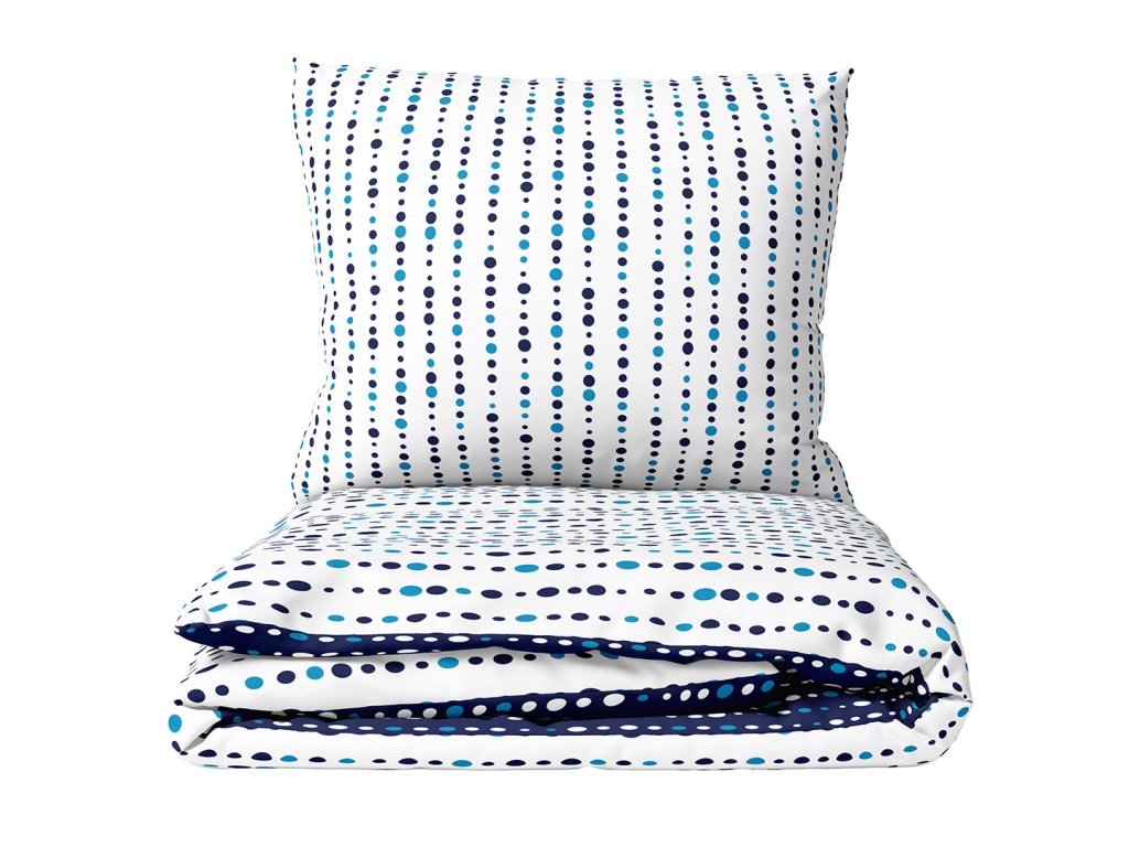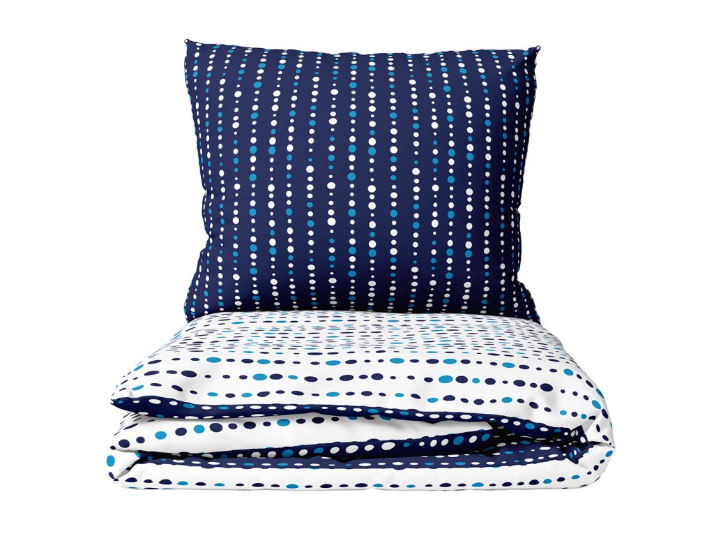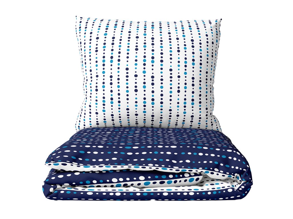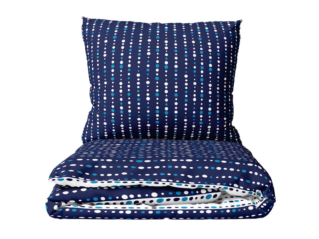 Motiv drobných puntíků v ledově modrých odstínech působí klidně, elegantně a vnáší do ložnice příjemnou atmosféru zimního pohodlí.