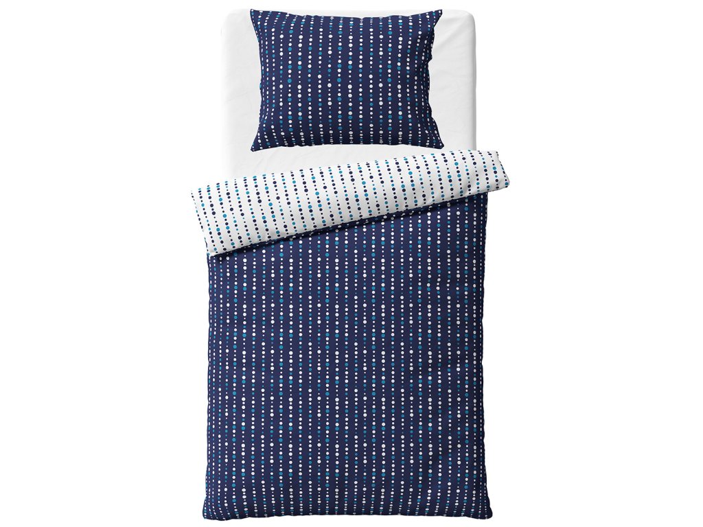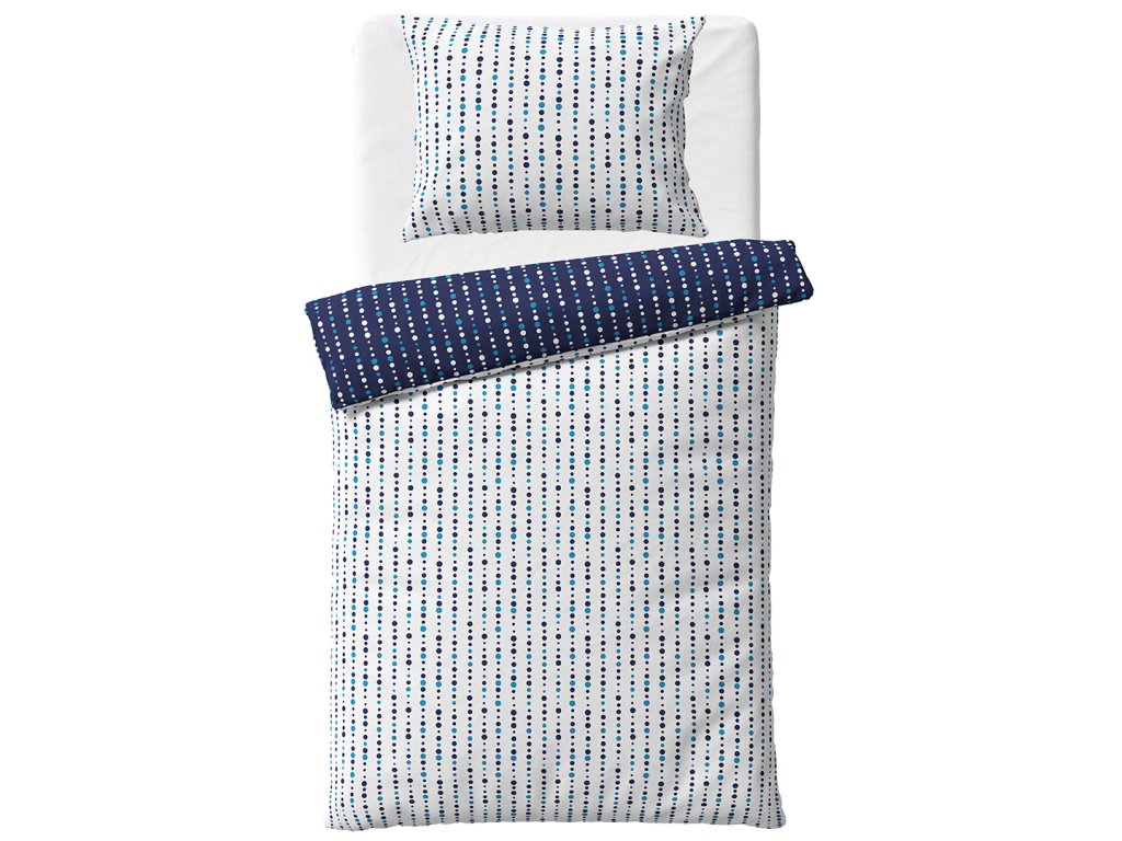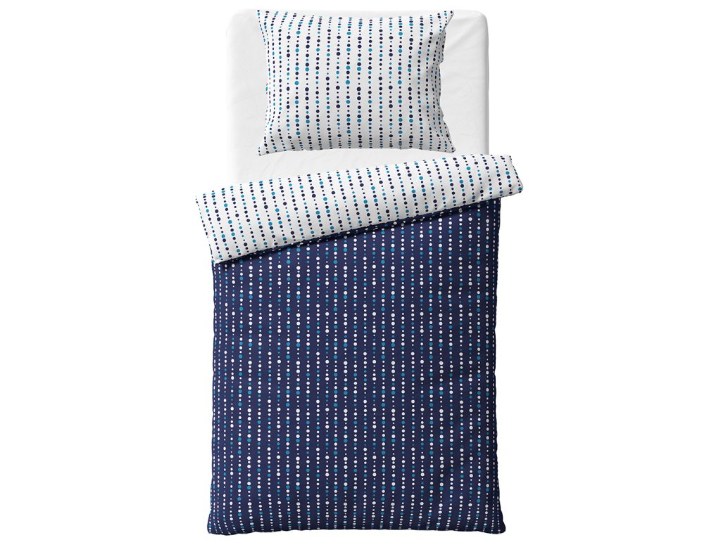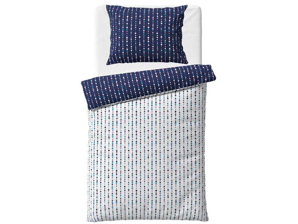 Motiv drobných puntíků v ledově modrých odstínech působí klidně, elegantně a vnáší do ložnice příjemnou atmosféru zimního pohodlí.