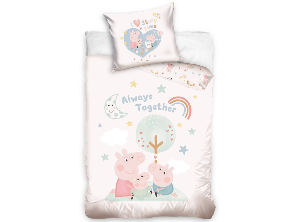 Na lícní straně peřinky se usmívá Peppa se svými sourozenci Tomíkem a Evie pod stromem, obklopená hvězdičkami, měsíčkem a duhou s nápisem Always Together