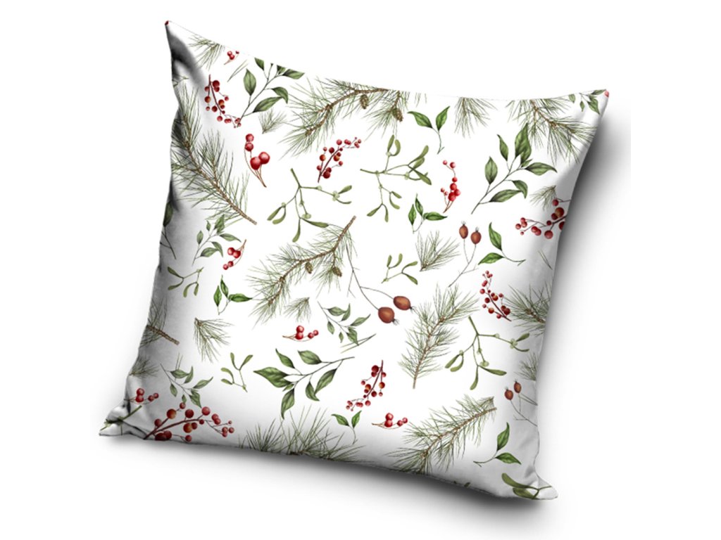 Na světlém podkladu se krásně vyjímají větvičky borovice, lístky jmelí a červené šípky s jeřabinami, které společně vytvářejí elegantní, přírodní motiv s nádechem sváteční atmosféry